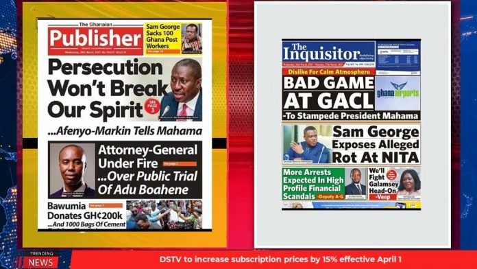 NewsGhana Newspaper Ghana Newspaper Headlines: March 26, 2025; Osahen Drops a bombshell; Mahama is sacking professionals and replacing them with party royalties 26th March 2025 0 203 Share Facebook Twitter WhatsApp Linkedin Pinterest Telegram Viber CJ’s tenure hangs in balance as Mahama consults over removal petitions Political persecution, You can arrest us, but we remain resolute – Afenyo Markin 2025 domestic bond re-entry seen as risky without debt alignment