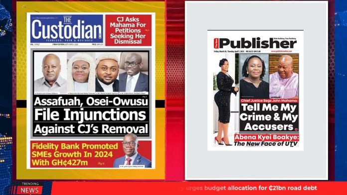 NewsGhana Newspaper Ghana Newspaper Headlines: March 28, 2025; Assafuah, Osei Owusu file injunctions against CJs removal 28th March 2025 0 143 Share Facebook Twitter WhatsApp Linkedin Pinterest Telegram Viber Chief Justice begs John Mahama, tell me my crime & my accusers Chief Justice Torkonoo chases Prez Mahama for copies of petitions calling for her removal 2 injunctions filed against CJs removal