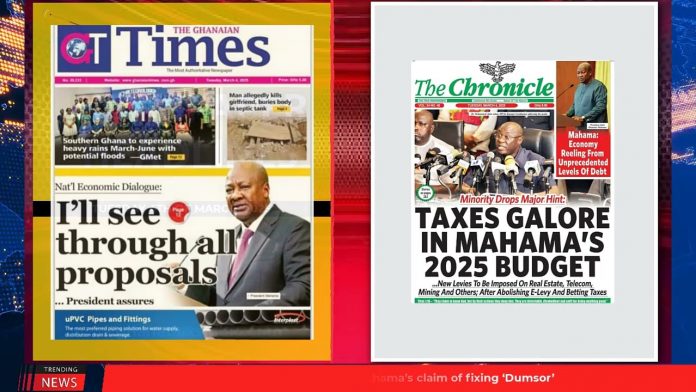 NewsGhana Newspaper Ghana Newspaper Headlines: March 4, 2025; Mahama sounds alarm, Economy needs radical overhaul 4th March 2025 0 43 Share Facebook Twitter WhatsApp Linkedin Pinterest Telegram Viber National Economic Dialogue; I’ll see through all proposals, President assures Ghana in economic crisis, claims finance minister I was asleep when Bawumia called to concede—Prez Mahama and MORE…