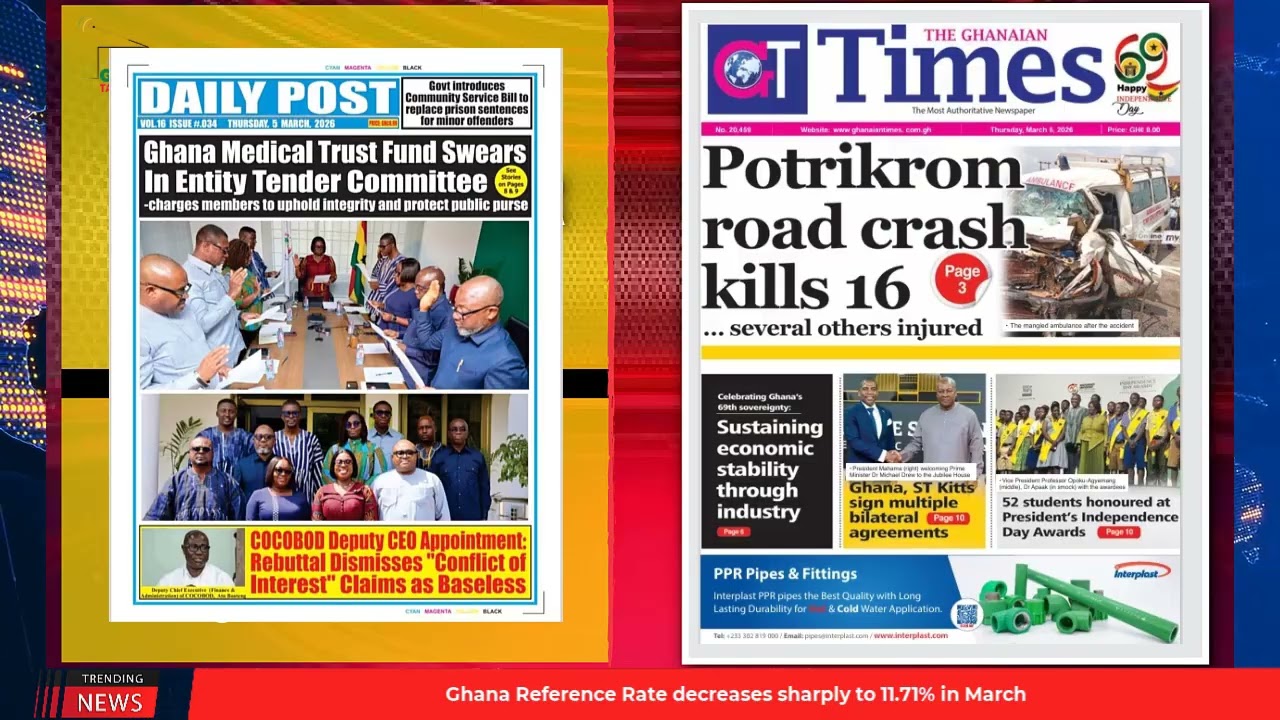 NewsGhana Newspaper Ghana Newspaper Headlines: March 5, 2026; Bawumia, Samira in Saudi Arabia: no evacuation – Aide 5th March 2026 0 2 Share Facebook Twitter WhatsApp Linkedin Pinterest Telegram Viber Potrikrom road crash kills 16 Galamsey devours 9,000 hectares 50 oil companies owe Govt GHc986m in taxes and MORE…