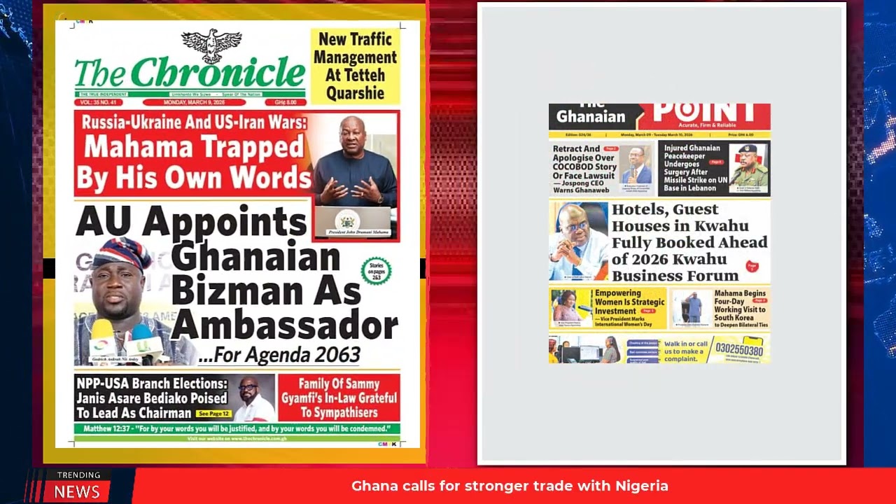 NewsGhana Newspaper Ghana Newspaper Headlines: March 9, 2026; ‘Fraud Boy’ Pleads Guilty To $10m Romance Scam In US 9th March 2026 0 6 Share Facebook Twitter WhatsApp Linkedin Pinterest Telegram Viber Mahama Double-Speaks On Impact Of External Shocks On Ghana Ghana Climbs Africa Trade Rankings AU Appoints Ghanaian Bizman As Ambassador For Agenda 2063 and MORE…