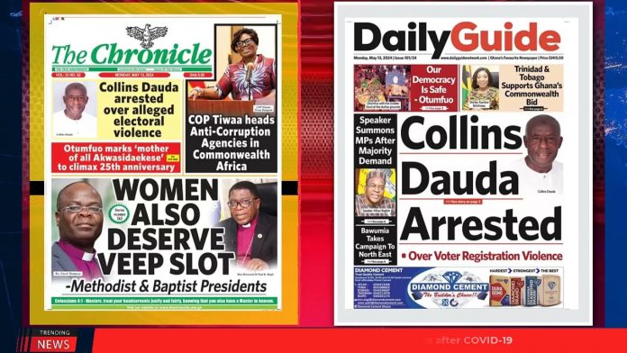 NewsGhana Newspaper Ghana Newspaper Headlines: May 13, 2024; Collins Dauda Arrested 13th May 2024 0 152 Share Facebook Twitter WhatsApp Linkedin Pinterest Telegram Viber -Women Also Deserve Veep Slot – Methodist & Baptist Presidents -Power Sector Challenges: Payment System Suffocates VRA -IMF, World Bank Under Pressure -Collins Dauda Arrested and MORE…