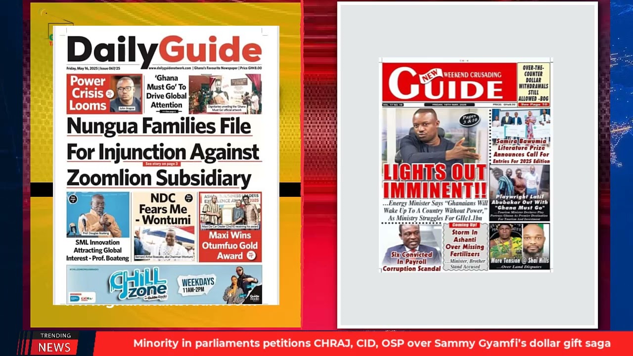NewsGhana Newspaper Ghana Newspaper Headlines: May 16, 2025; Nungua Families File For Injunction Against Zoomlion Subsidiary 16th May 2025 0 40 Share Facebook Twitter WhatsApp Linkedin Pinterest Telegram Viber Ghanaian theatre goes global Get off pavements and footbridges; AMA gives traders Tuesday deadline BOG Cuts Adongo To Size and MORE…