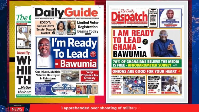 NewsGhana Newspaper Ghana Newspaper Headlines: May 7, 2024; I’m Ready To Lead 7th May 2024 0 120 Share Facebook Twitter WhatsApp Linkedin Pinterest Telegram Viber -Limited Voter Registration Starts Today -Rainstorm Wreaks Havoc In Accra -Nana Replies Critics As He Guarantees Stability -I’m Ready To Lead and MORE…