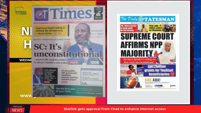 NewsGhana Newspaper Ghana Newspaper Headlines: Nov. 13, 2024; SC Overturns Bagbin, Reinstates Four MPs 13th November 2024 0 83 Share Facebook Twitter WhatsApp Linkedin Pinterest Telegram Viber After cacophony of noise; Galamsey fight is dead Supreme Court quashes speakers decision; Four MPs remain in parliament Majority Leader welcomes SC ruling, Urges speaker to reconvene parliament and MORE…