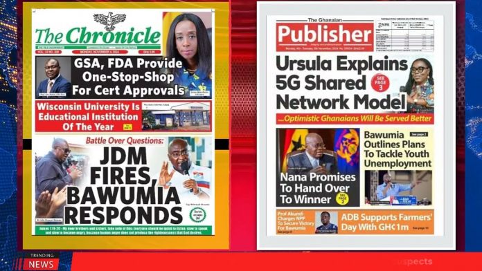NewsGhana Newspaper Ghana Newspaper Headlines: Nov. 4, 2024; Vote For Your Future, Bawumia To Youth 4th November 2024 0 85 Share Facebook Twitter WhatsApp Linkedin Pinterest Telegram Viber I’ll hand over to winner, President assures nations Bawumia Outlines Plans To Create 4m Jobs Battle Over Questions; JDM Fires, Bawumia Responds and MORE…