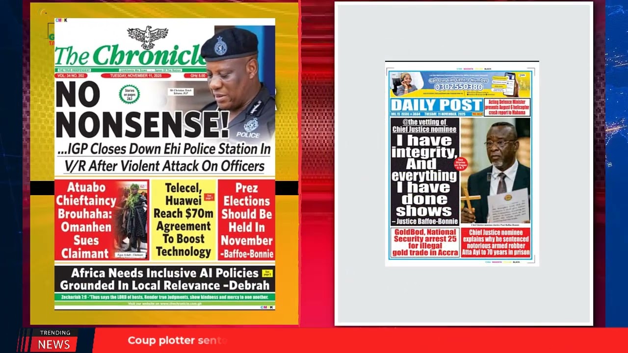 NewsGhana Newspaper Ghana Newspaper Headlines: November 11, 2025; Minority Boycotts CJ Nominee Amid Drama 11th November 2025 0 2 Share Facebook Twitter WhatsApp Linkedin Pinterest Telegram Viber My nomination is meritorious… Acting CJ states The Ghanaian media should be the vigilant watchdog of the people Sky train case: Key witnesses quizzed over poor attention to detail and MORE…