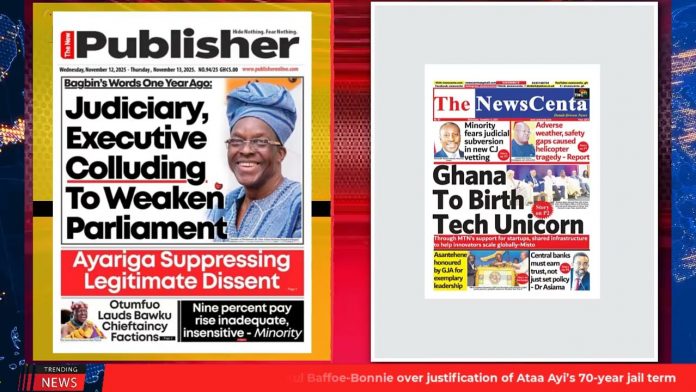 NewsGhana Newspaper Ghana Newspaper Headlines: November 12, 2025; Aug 6 Helicopter Disaster: Bad Weather Cause of Crash – Investigations 12th November 2025 0 2 Share Facebook Twitter WhatsApp Linkedin Pinterest Telegram Viber Afenyo-Markin Labels CJ Vetting Disgraceful Ghana to birth Tech Unicorn Chinese Investors Frustrated… and MORE…