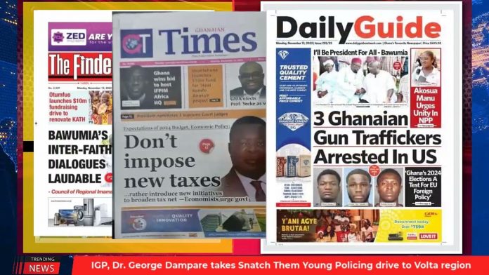 NewsGhana Newspaper Ghana Newspaper Headlines | November 13 | 2023; Don’t Impose New Taxes 13th November 2023 0 284 Share Facebook Twitter WhatsApp Linkedin Pinterest Telegram Viber -Bawumia’s Inter-faith Dialogues Laudable -3 Cement Factories Shut Down -3 Ghanaian Gun Traffickers Arrested In Us -Don’t Impose New Taxes and MORE…