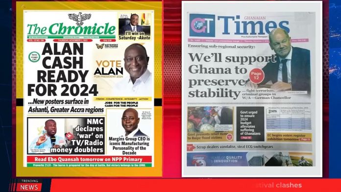 NewsGhana Newspaper Ghana Newspaper Headlines | November 2 | 2023; Alan Cash Ready For 2024 2nd November 2023 0 125 Share Facebook Twitter WhatsApp Linkedin Pinterest Telegram Viber -NPP Inches Towards Showdown -Kasoa Cops Killer Jailed For 20 Years -Reggae Music Makes More Sense – Ras Kuuku -Alan Cash Ready For 2024 and MORE…