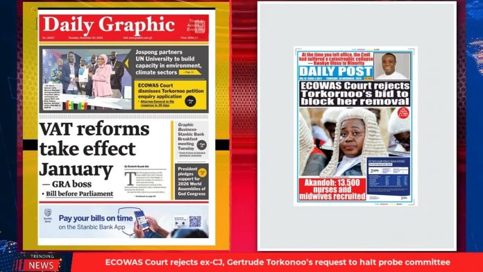 NewsGhana Newspaper Ghana Newspaper Headlines: November 20, 2025; 2 Presidential Jets, Copters To Cost GHc13.1bn – Abu Jinapor 20th November 2025 0 4 Share Facebook Twitter WhatsApp Linkedin Pinterest Telegram Viber ECOWAS Court rejects Torkonoo’s bid to block her removal VAT reforms take effect January – GRA boss Ken Ofori-Atta no longer on INTERPOL’s ‘red notice’ list. and MORE…
