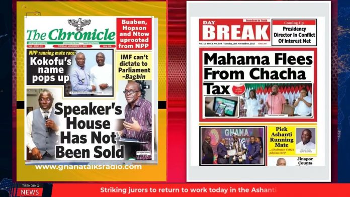 NewsGhana Newspaper Ghana Newspaper Headlines | November 21 | 2023; NPP Sacks 4 ‘Rebels’ 21st November 2023 0 131 Share Facebook Twitter WhatsApp Linkedin Pinterest Telegram Viber -Speaker’s House Has Not Been Sold -Mahama Flees From Chacha Tax -3 Cement Factories Defy GSA Ban -NPP Sacks 4 ‘Rebels’ and MORE…