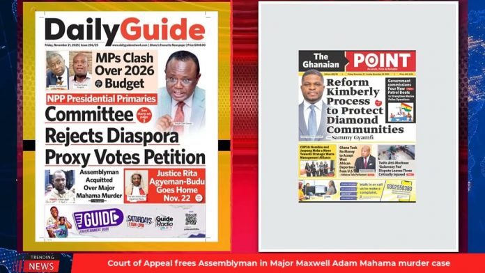 NewsGhana Newspaper Ghana Newspaper Headlines: November 21, 2025; Committee rejects diaspora proxy votes petition 21st November 2025 0 1 Share Facebook Twitter WhatsApp Linkedin Pinterest Telegram Viber Economy grows 5.1% in August, service sector expands by 9.6% – Govt Statistician No more Cheque payments by public sector – Electronic transfer takes effect next quarter NPP Presidential primary in danger and MORE…
