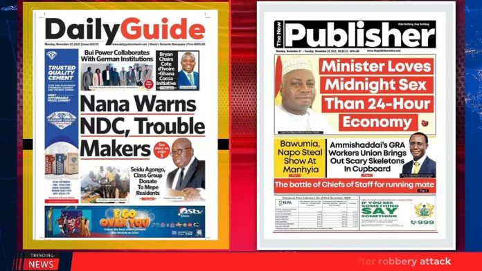 NewsGhana Newspaper Ghana Newspaper Headlines | November 27 | 2023; Dame Stops Torrenco 27th November 2023 0 132 Share Facebook Twitter WhatsApp Linkedin Pinterest Telegram Viber -NSA Boss Accused! -I’ll guard country’s peace -Minister Loves Midnight Sex Than 24-Hour Economy -Dame Stops Torrenco and MORE…
