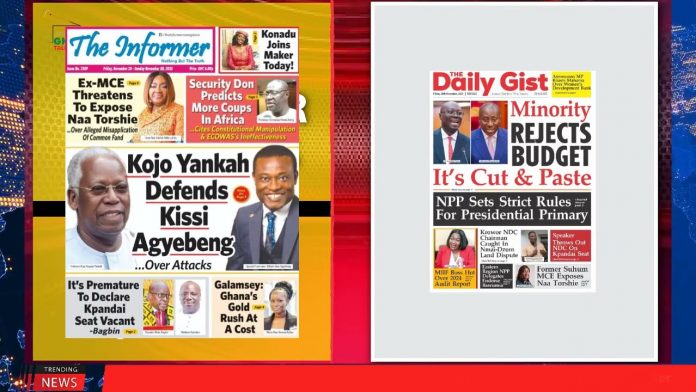 NewsGhana Newspaper Ghana Newspaper Headlines: November 28, 2025; Matthew Nyindam is qualified MP 28th November 2025 0 15 Share Facebook Twitter WhatsApp Linkedin Pinterest Telegram Viber Ghana sold out Lithium deal – Minority This NDC Gov’t is clueless… NDC team inspects GHc13bn airbus luxury jets and MORE…