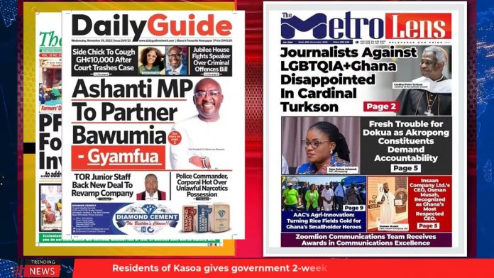 NewsGhana Newspaper Ghana Newspaper Headlines | November 29 | 2023; Bagbin, Minority Erred 29th November 2023 0 124 Share Facebook Twitter WhatsApp Linkedin Pinterest Telegram Viber -E-Jobs 4 All: Govt Targets 10,000 Youth -Ashanti MP To Partner Bawumia – Gyamfua -Journalists Against LGBTQIA+Ghana Disappointed In Cardinal Turkson -Bagbin, Minority Erred and MORE…