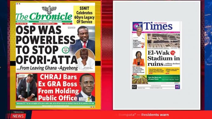 NewsGhana Newspaper Ghana Newspaper Headlines: November 6, 2025; CHRAJ Indicts Ex-GRA Boss For GHc9m ‘Fraud’ 6th November 2025 0 3 Share Facebook Twitter WhatsApp Linkedin Pinterest Telegram Viber El-Wak stadium in ruins Husband burns wife, 5 children OSP was powerless to stop Ofori-Atta and MORE…