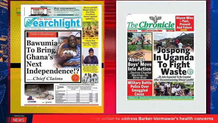 NewsGhana Newspaper Ghana Newspaper Headlines: Oct. 11, 2024; Centralized governance system must change, Okyenhene 11th October 2024 0 100 Share Facebook Twitter WhatsApp Linkedin Pinterest Telegram Viber War on Galamsey, Military barrels along Birim river destroys Chanfans other machines Truth or Blasphemy, Bawumia to bring Ghana’s next independence, chief claims JOSPONG in Uganda to fight waste and MORE…