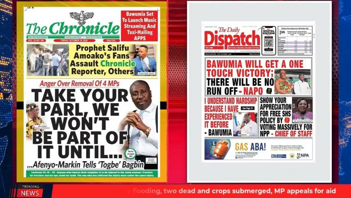 NewsGhana Newspaper Ghana Newspaper Headlines: Oct. 18, 2024; Speaker kicks out 4 MPs, NPP Boycott parliament 18th October 2024 0 85 Share Facebook Twitter WhatsApp Linkedin Pinterest Telegram Viber Drama in parliament, speaker Declares 4 seat vacant Bawumia Will get a one touch victory: There will be no run off- NAPO All Set for Ghana Card rollout globally, Starting from Denmark on Tuesday and MORE…