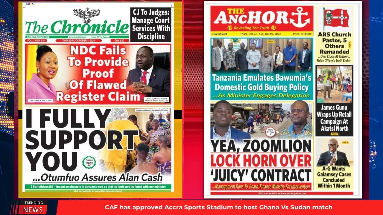 NewsGhana Newspaper Ghana Newspaper Headlines: Oct. 3, 2024; 2024 Voters Register, NDC Abandons Forensic Audit Call 3rd October 2024 0 97 Share Facebook Twitter WhatsApp Linkedin Pinterest Telegram Viber The NDC will reject the results if they lose the Prez Elections—CENPOA Expedite hearing on Galamsey cases – Attorney General to Judge I fully support you – Otumfuor assures Alan Cash and MORE…