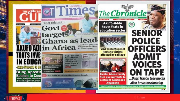 NewsGhana Newspaper Ghana Newspaper Headlines | October 12 | 2023; Inflation Rate Drops To 38.1% 12th October 2023 0 188 Share Facebook Twitter WhatsApp Linkedin Pinterest Telegram Viber -Dampare Lobbied For IGP Job -Govt Targets Ghana As Leader In Africa -GHc115bn Goes Into Education Since 2017 -Inflation Rate Drops To 38.1% and MORE…
