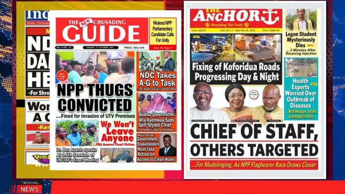 NewsGhana Newspaper Ghana Newspaper Headlines | October 17 | 2023; NPP Thugs Convicted 17th October 2023 0 179 Share Facebook Twitter WhatsApp Linkedin Pinterest Telegram Viber -Akosombo Dam Spillage: Gov’t Moves To Rescue -NDC After Dame’s Head For Shredding Prof. Frimpong Boateng’s Gala Report -Human Right Abuse Under Dampare’s Nose -NPP Thugs Convicted and MORE…