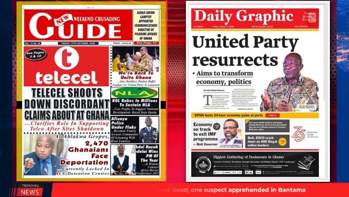 NewsGhana Newspaper Ghana Newspaper Headlines: October 17, 2025; Gold Exports Peak To $8bn 17th October 2025 0 10 Share Facebook Twitter WhatsApp Linkedin Pinterest Telegram Viber KGL Fuels NLA’s Growth – Dr Opoku …Alan Unveils United Party Mahama’s Goldbod Performing Wonders and MORE…