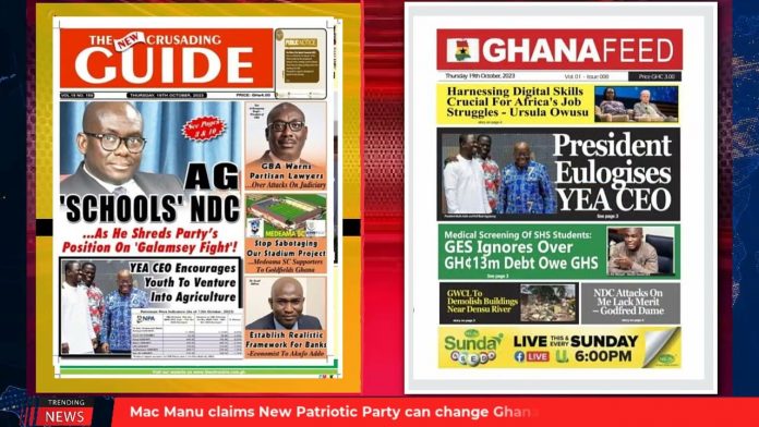 NewsGhana Newspaper Ghana Newspaper Headlines | October 19 | 2023; AG ‘Schools’ NDC 19th October 2023 0 150 Share Facebook Twitter WhatsApp Linkedin Pinterest Telegram Viber -‘Small Boy’ Agyebeng Insists Judge Must Go -Dam Spillage: World Bank Votes $40m For Farmers -President Eulogises YEA CEO -AG ‘Schools’ NDC and MORE…