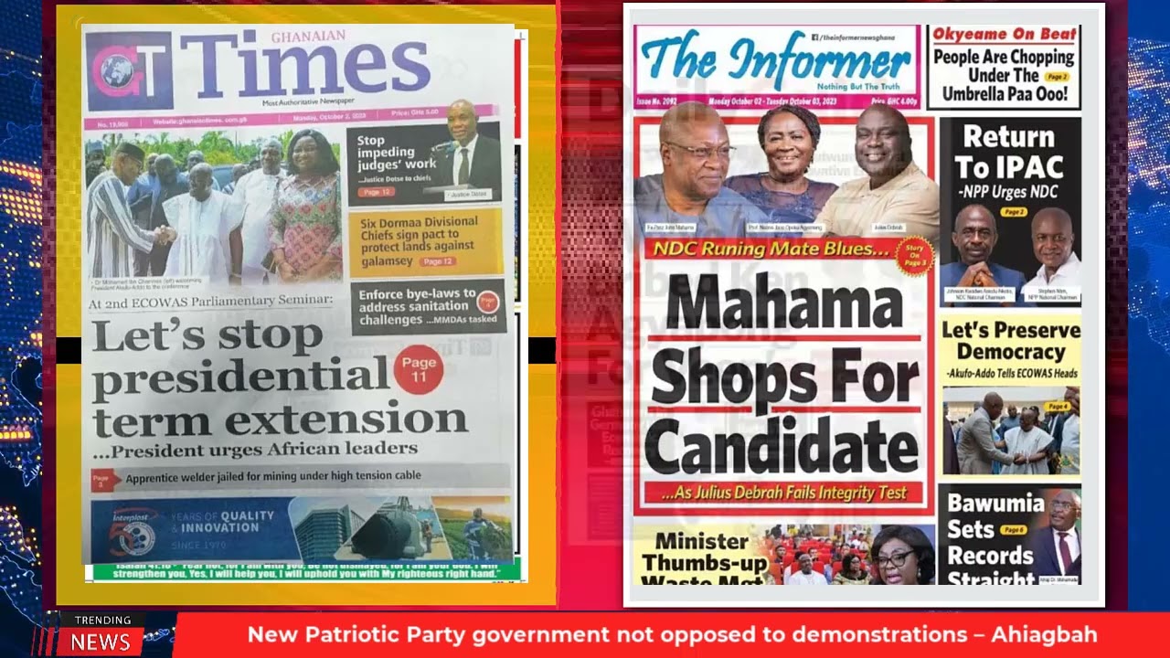 NewsGhana Newspaper Ghana Newspaper Headlines | October 2 | 2023; Mahama Shops For Candidate 2nd October 2023 0 137 Share Facebook Twitter WhatsApp Linkedin Pinterest Telegram Viber -‘We’ve Not Bribed Ken Agyapong For Veep’ -Let’s Stop Presidential Term Extension -Save Democracy In Sub-region -Mahama Shops For Candidate and MORE…