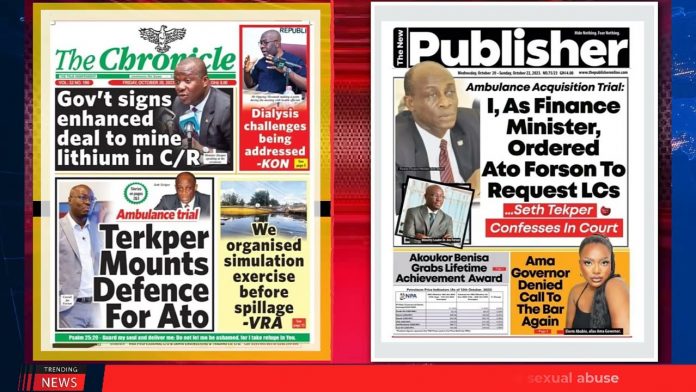 NewsGhana Newspaper Ghana Newspaper Headlines | October 20 | 2023; Terkper Mounts Defense For Ato 20th October 2023 0 124 Share Facebook Twitter WhatsApp Linkedin Pinterest Telegram Viber -I Ordered Ato Forson To Request LCs From BoG -Rising Cost Of Dialysis: Akufo-Addo Tasks NHIA, MoH To Find Solutions -Lithium Mining Gets Green Light -Terkper Mounts Defense For Ato and MORE…