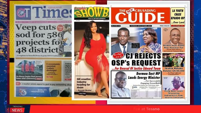 NewsGhana Newspaper Ghana Newspaper Headlines | October 26 | 2023; CJ Bounces OSP 26th October 2023 0 152 Share Facebook Twitter WhatsApp Linkedin Pinterest Telegram Viber -Develop Mining Areas Deliberately -Veep Cuts Sod For 586 Projects For 48 Districts -MUSIGA Is Not A ‘Cartel’ – Bessa Simons -CJ Bounces OSP and MORE…