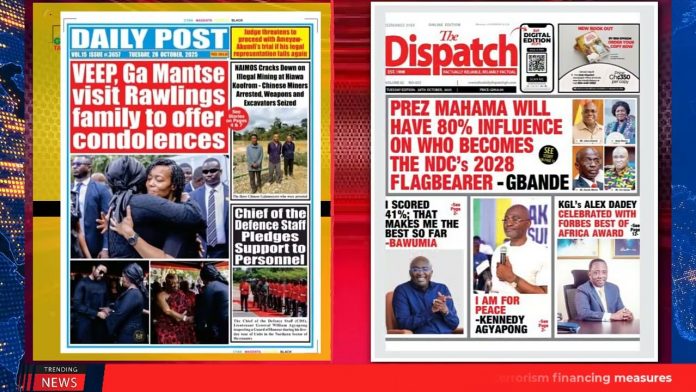 NewsGhana Newspaper Ghana Newspaper Headlines: October 28, 2025; Cabinet Warns Ministers Over Unapproved Policy Announcements 28th October 2025 0 1 Share Facebook Twitter WhatsApp Linkedin Pinterest Telegram Viber Govt eyes 500,000 agric jobs VEEP, Ga Mantse Visit Rawlings family to offer condolences Kwabena Agyepong: I’m still in the race and MORE…
