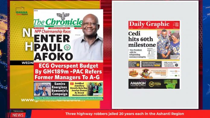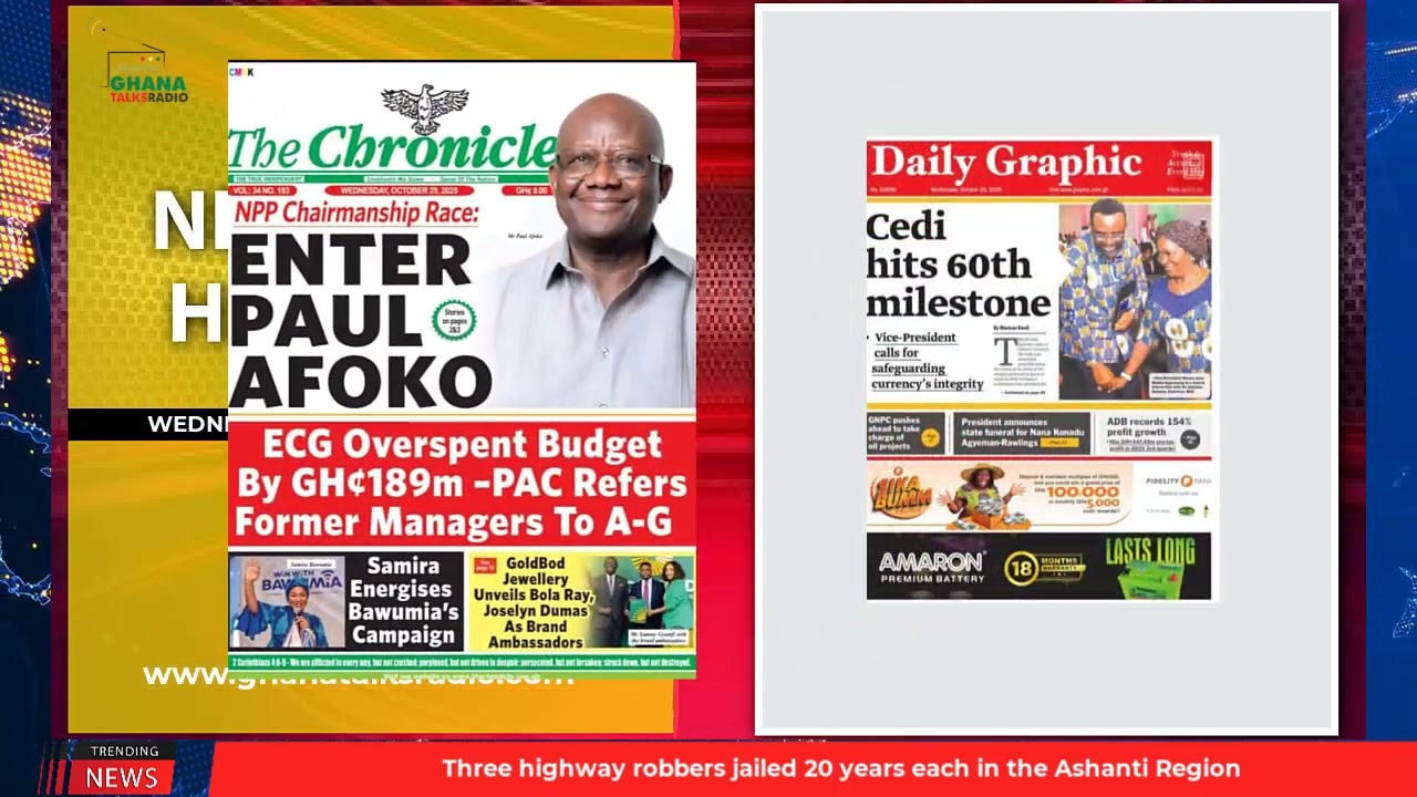 NewsGhana Newspaper Ghana Newspaper Headlines: October 29, 2025; Gay Bill Died With 8th Parliament – Speaker 29th October 2025 0 2 Share Facebook Twitter WhatsApp Linkedin Pinterest Telegram Viber Cedi hits 60th milestone Stop your unlawful media trial Africa must lead with purpose and MORE…
