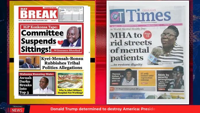 NewsGhana Newspaper Ghana Newspaper Headlines | October 3 | 2023; Committee Suspends Sittings 3rd October 2023 0 181 Share Facebook Twitter WhatsApp Linkedin Pinterest Telegram Viber -Galamsey Fight: 21 Jailed 340 Years -‘Killer’ Houseboy Pleads Guilty -Adutwum Migrates Education To Online -Committee Suspends Sittings and MORE…