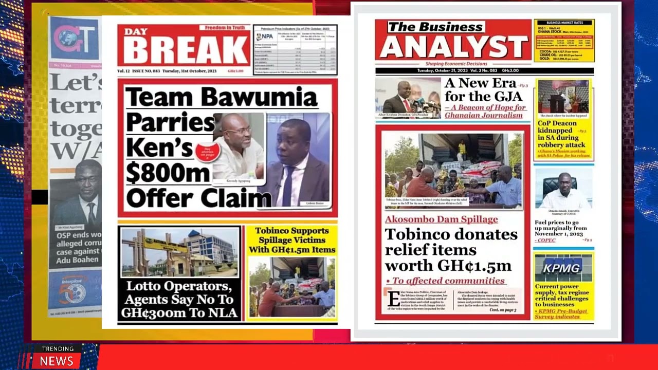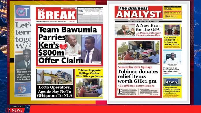 NewsGhana Newspaper Ghana Newspaper Headlines | October 31 | 2023; A New Era For The GJA 31st October 2023 0 283 Share Facebook Twitter WhatsApp Linkedin Pinterest Telegram Viber -We Never Offered Ken $800m – Bawumia Team -$450m Manganese Refinery Set For Nsuta -Let’s Fight Terrorism Together In W/A – Pres Appeals To Sub-regional Leaders -A New Era For The GJA and MORE…