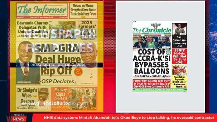 NewsGhana Newspaper Ghana Newspaper Headlines: October 31, 2025; Osei Assibey Slapped With GHc800m Bail 31st October 2025 0 1 Share Facebook Twitter WhatsApp Linkedin Pinterest Telegram Viber Ghana and France deepen bond 1.3 million metric tonnes paddy rice locked up for lack of market Mahama refuses RTI request on ex-gratia payments and MORE…