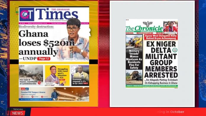 NewsGhana Newspaper Ghana Newspaper Headlines: September 11, 2025; Bawumia Slams NDC Over Power Abuse 11th September 2025 0 21 Share Facebook Twitter WhatsApp Linkedin Pinterest Telegram Viber Ghana Loses $520m Annually – UNDP Abronye’s Arrest: IGP Should Know Better! – NPP Fight Against Galamsey: State Of Emergency Last Resort and MORE…