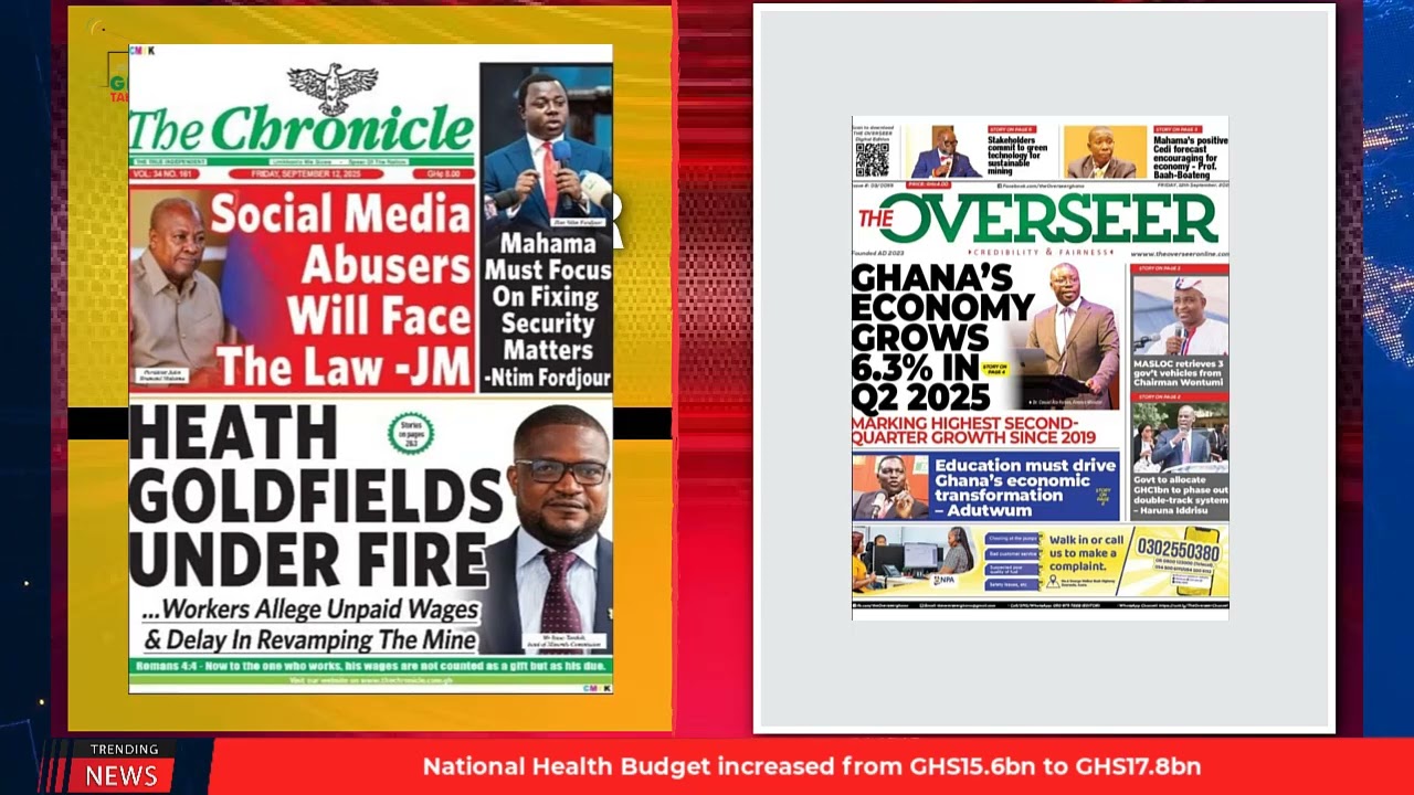NewsGhana Newspaper Ghana Newspaper Headlines: September 12, 2025; President Mahama Flags $42b Import Scam 12th September 2025 0 16 Share Facebook Twitter WhatsApp Linkedin Pinterest Telegram Viber Health Goldfields’ Workers Bare Teeth Over Unpaid Wages Social Media Abusers Will Face The Law – JM Ghana’s Economy Grows 6.3% In Q2 2025 and MORE…