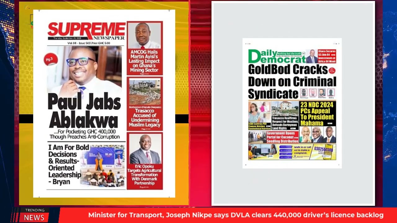 NewsGhana Newspaper Ghana Newspaper Headlines: September 18, 2025; Selective Justice, Mass Dismissals Erode Mahama’s Goodwill 18th September 2025 0 21 Share Facebook Twitter WhatsApp Linkedin Pinterest Telegram Viber GoldBod Cracks Down On Criminal Syndicate GIS Officers on Rampage? Court Set Sept 25 For Suhum Election Dispute and MORE…