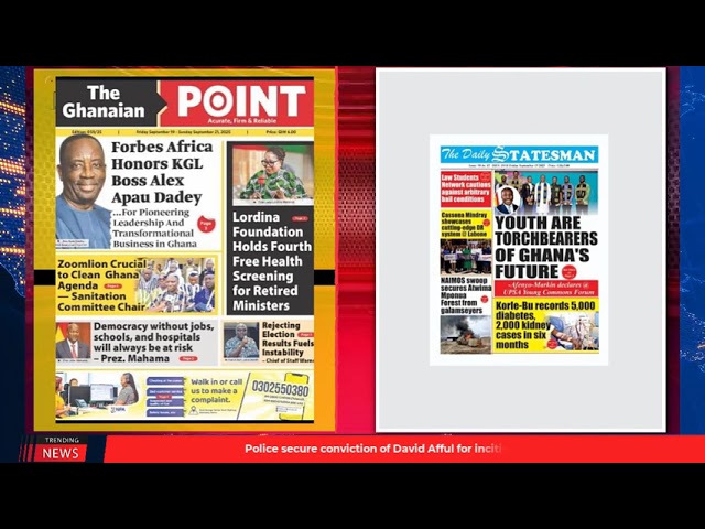 NewsGhana Newspaper Ghana Newspaper Headlines: September 19, 2025; Asantehemaa Goes Home 19th September 2025 0 18 Share Facebook Twitter WhatsApp Linkedin Pinterest Telegram Viber …Stay Away Or Do Galamsey At Your Own Peril! Torkonoo Drags Mahama To Court Forbes Africa Honors KGL Boss Alex Apau Dadey and MORE…
