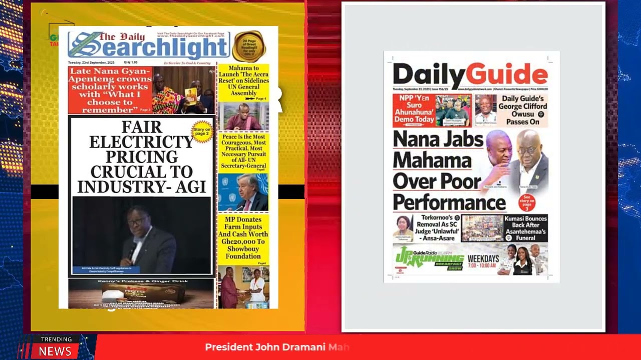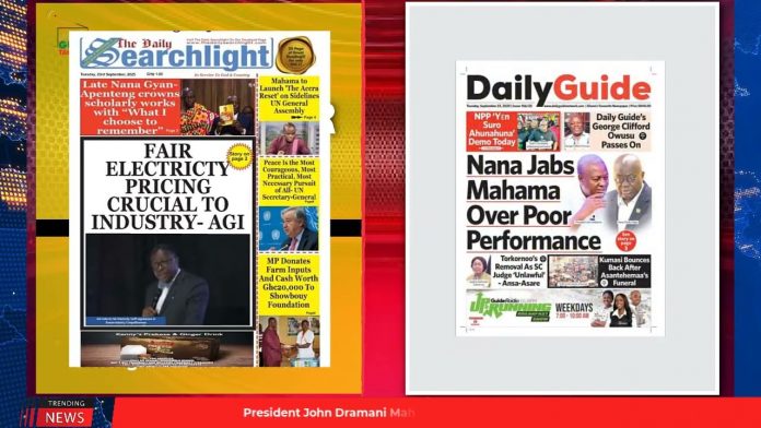 NewsGhana Newspaper Ghana Newspaper Headlines: September 23, 2025; Nana Jabs Mahama Over Poor Performance 23rd September 2025 0 22 Share Facebook Twitter WhatsApp Linkedin Pinterest Telegram Viber Bryan’s Bold Cocoa Move Fair Electricity Pricing Crucial To Industry – AGI SHS Students Must Use Harmonised Prospectus and MORE…