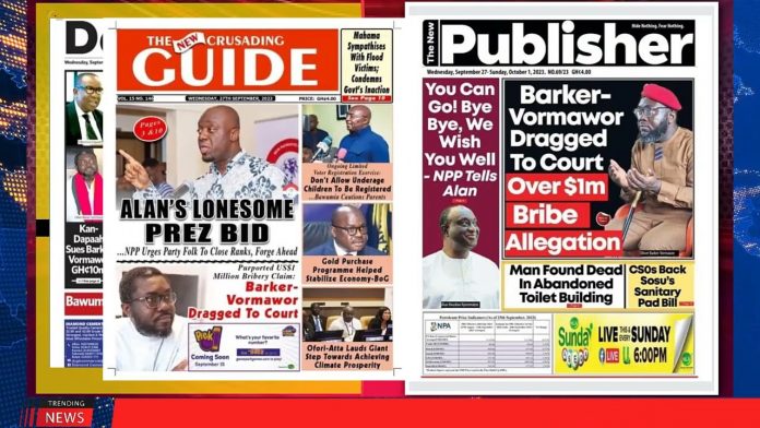 NewsGhana Newspaper Ghana Newspaper Headlines| September 27 | 2023; NPP Slams Alan 27th September 2023 0 199 Share Facebook Twitter WhatsApp Linkedin Pinterest Telegram Viber -Commuters Forced To Pay More! -NPP Slams Alan -Barker-Vormawor Dragged To Court Over $1m Bribe Allegation -GOIL Plant To Reduce Bitumen Import and MORE…