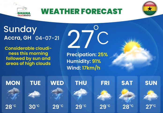 A morning thunderstorm in parts of the area; otherwise, cloudy