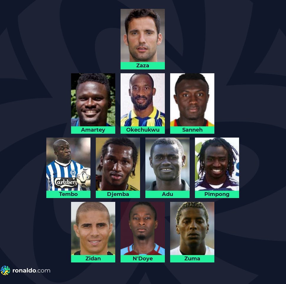 Andrew Tembo (Zambia & Odense BK), Eric Djemba Djemba (Cameroon & FC Copenhagen), Enoch Kofi Adu (Ghana & FC Copenhagen), and Razak Pimpong (Ghana & FC Copenhagen) complete the midfield selection.