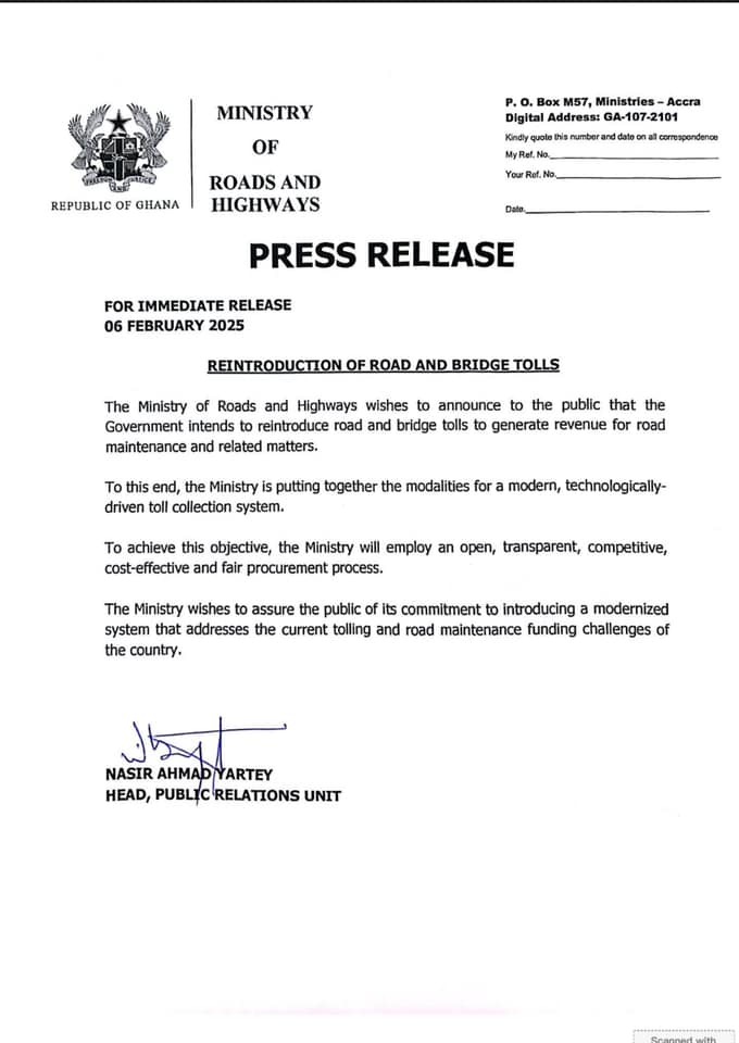 The Ministry of Roads and Highways has announced the reintroduction of road and bridge tolls to generate revenue for road maintenance and related initiatives.