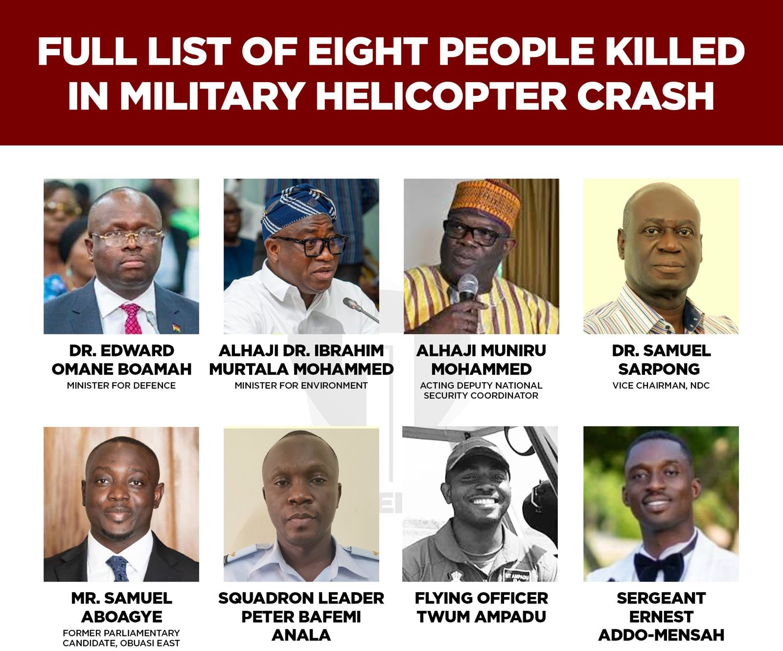 Among those who perished in the crash were Defence Minister Dr. Edward Omane Boamah, Environment Minister Dr. Ibrahim Murtala Mohammed, senior security officials, and military personnel.