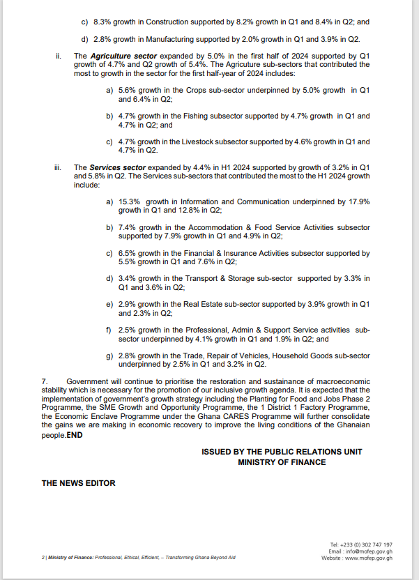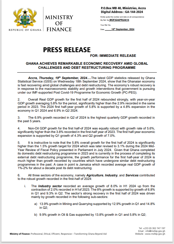 In a statement on September 19, the MoF highlighted that the implementation of the government’s growth strategy—including the Planting for Food and Jobs Phase 2 Programme, the SME Growth and Opportunity Programme, the 1 District 1 Factory Programme, and the Economic Enclave Programme under the Ghana CARES Programme—will further solidify the gains made in economic recovery and enhance the living conditions of Ghanaians.