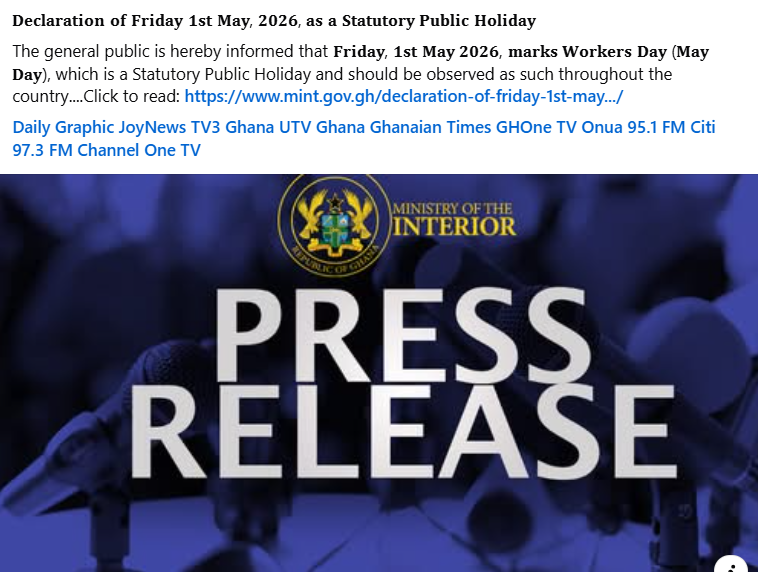 In a statement issued on April 27, 2026, and signed by the Interior Minister, Muntaka Mohammed-Mubarak, the Ministry urged the public to observe the day nationwide.
