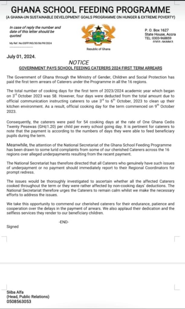 In a statement released on July 1, the School Feeding Secretariat confirmed, “The Government of Ghana, through the Ministry of Gender, Children and Social Protection, has settled the first term arrears of Caterers under the Programme in all the 16 regions.”