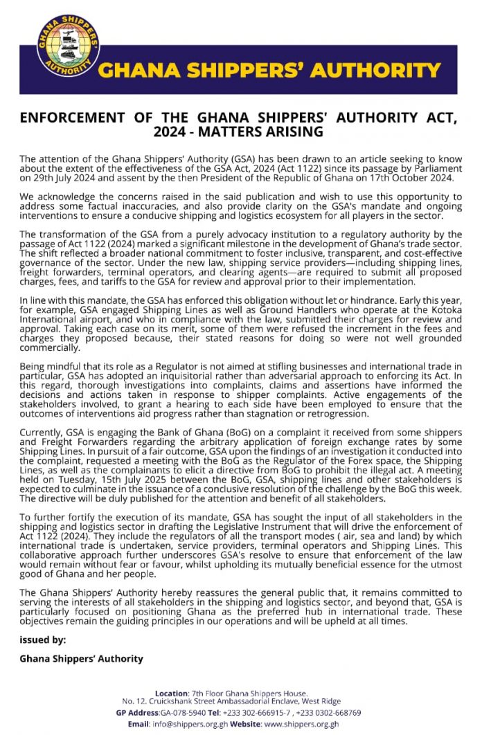 The Ghana Shippers’ Authority (GSA) has stepped up enforcement of the Ghana Shippers’ Authority Act, 2024 (Act 1122), amid rising concerns over its implementation and effectiveness in regulating Ghana’s shipping and logistics sector.